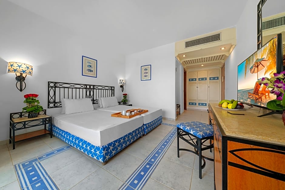 Aquamarine Queen or Twin Room - Beach Front - Triple Occupany is 420 square feet and includes either a king-size bed 150-183 width, a queen-size bed 150-154 width, or 2 single beds 80-130 width plus a sofa bed plus extra beds on demand and bathrobes and is Wheelchair-accessible.